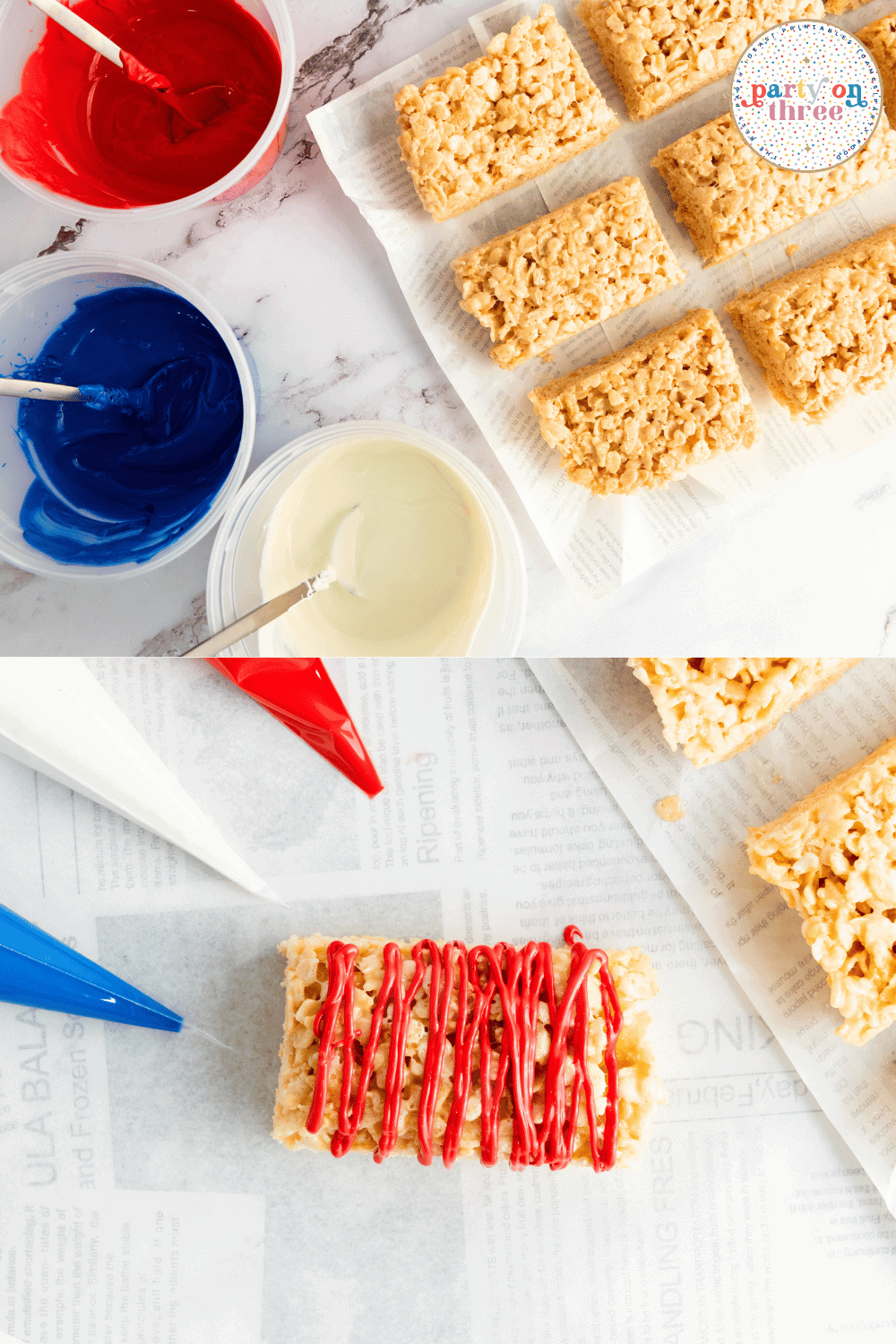 Melt the red, white, and blue candy melts in separate bowls or medium microwave-safe bowls, heating in second intervals until smooth. Transfer melted chocolate to piping bags or zip-top bags and snip the tip for easy drizzling.