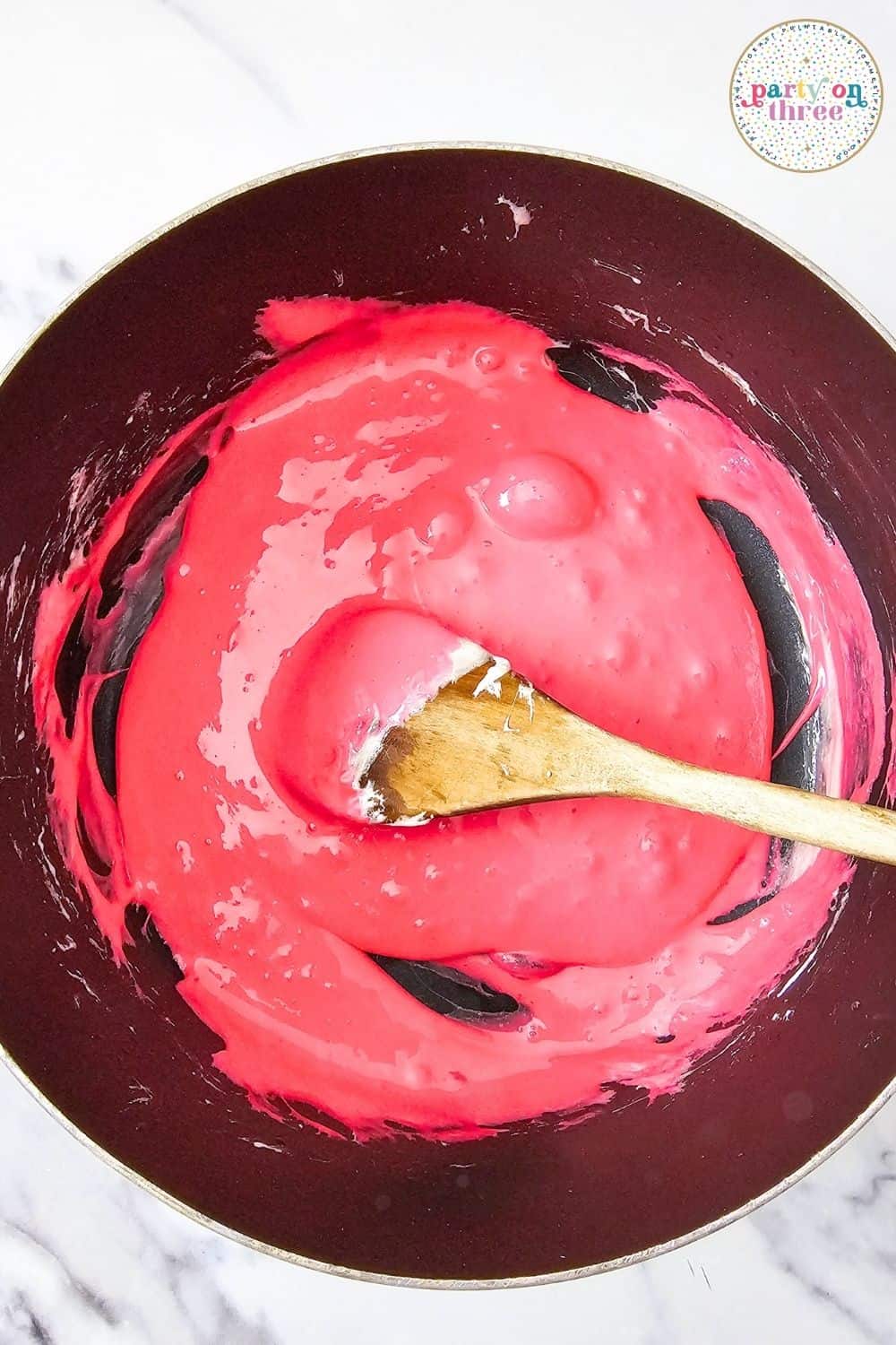 - Melt butter in a large pot over low heat. Add marshmallows and stir until smooth. Tint with red food coloring until pink.